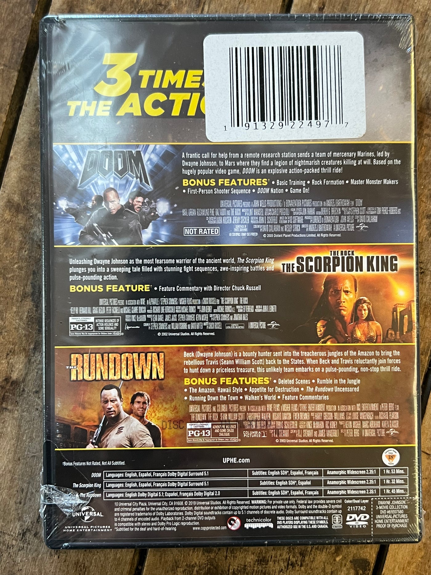 Dwayne Johnson 3-Movie Collection available on DVD includes early action films: Doom, The Scorpion King, and The Rundown, released by Universal Studios. These PG-13 rated adventure movies showcase Johnson as "The Rock" in monster-fighting, ancient warrior, and jungle bounty hunter roles, offering a classic collection for fans of his action-packed beginnings.